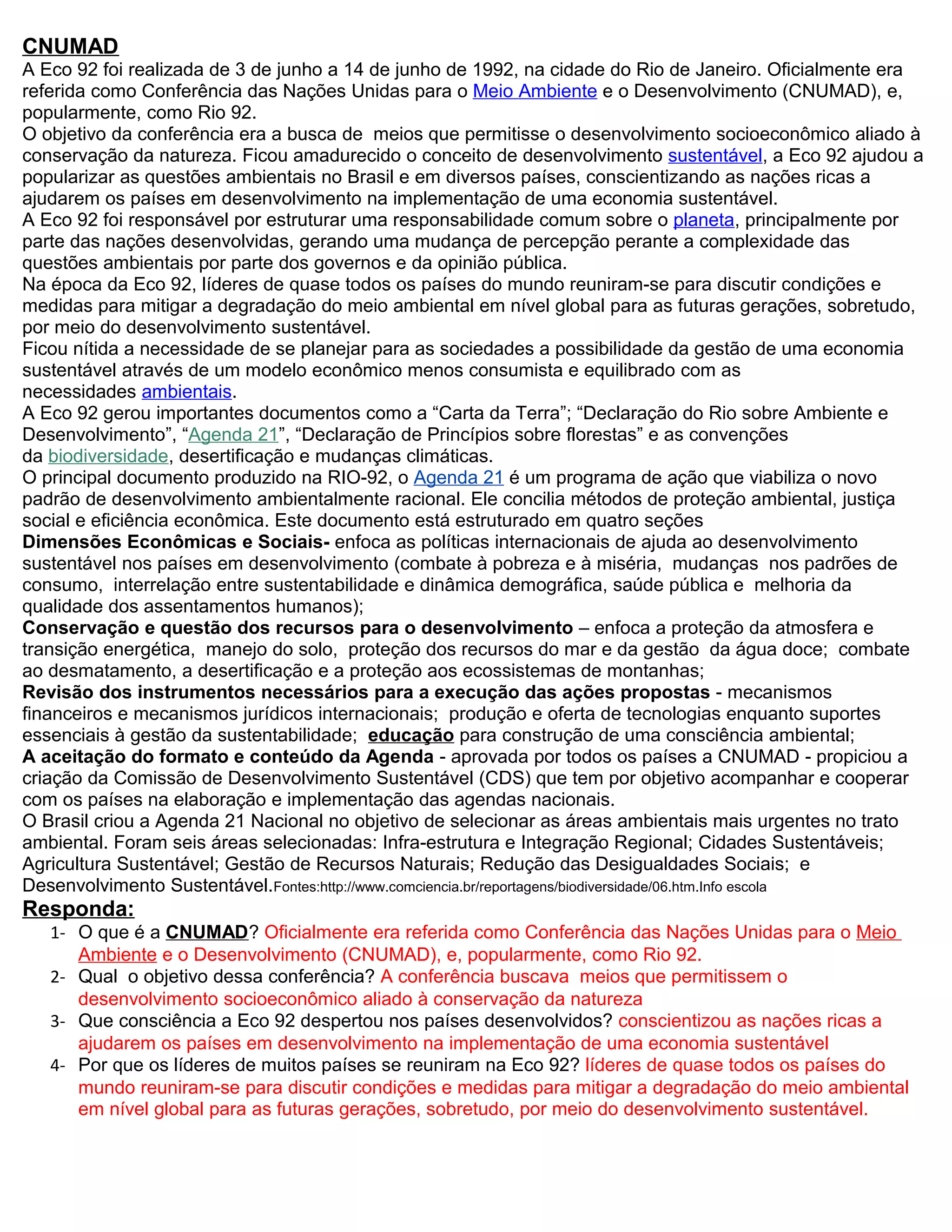 A Eco 92, oficialmente chamada de CNUMAD, foi realizada no Rio de Janeiro em 1992 e reuniu líderes mundiais para discutir medidas de desenvolvimento sustentável e mitigação de mudanças ambientais. A conferência ajudou a popularizar a ideia de economia verde e conscientizou nações ricas a apoiarem países em desenvolvimento nessa transição, além de gerar documentos importantes como a Agenda 21.