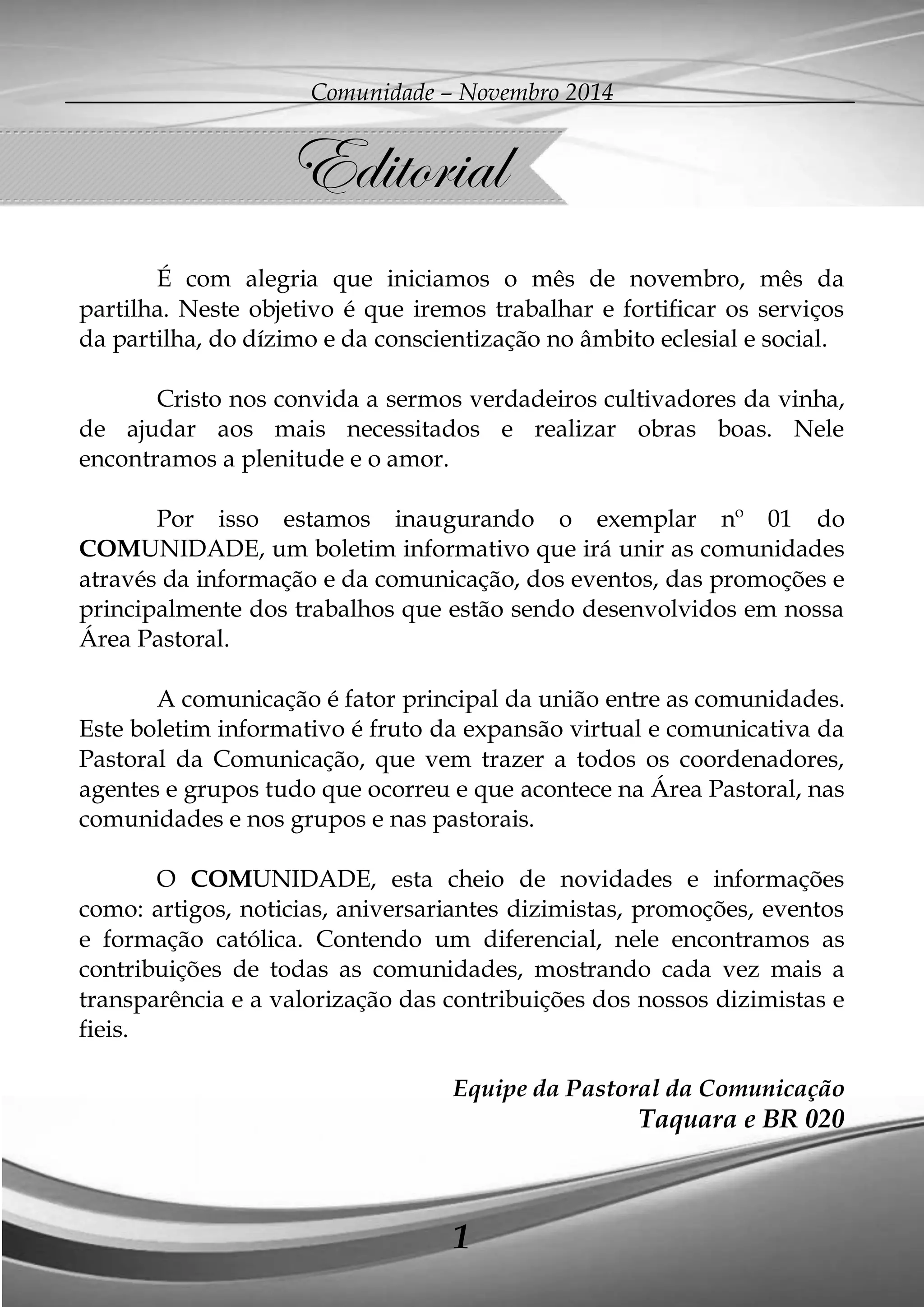 1) O documento descreve os eventos e atividades planejados para a comunidade católica no mês de novembro, incluindo a festa da padroeira Nossa Senhora da Imaculada Conceição e a 19a Carreata da Imaculada Conceição.