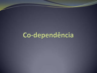 O documento discute a co-dependência, definindo-a como quando uma pessoa deixa o comportamento de outra afetá-la e é obcecada em controlar o comportamento da outra. A co-dependência surge na infância quando a pessoa se sente só e busca constantemente preencher esse "buraco". A solução é ter honestidade, abertura, desejo de mudança e depender de Deus.