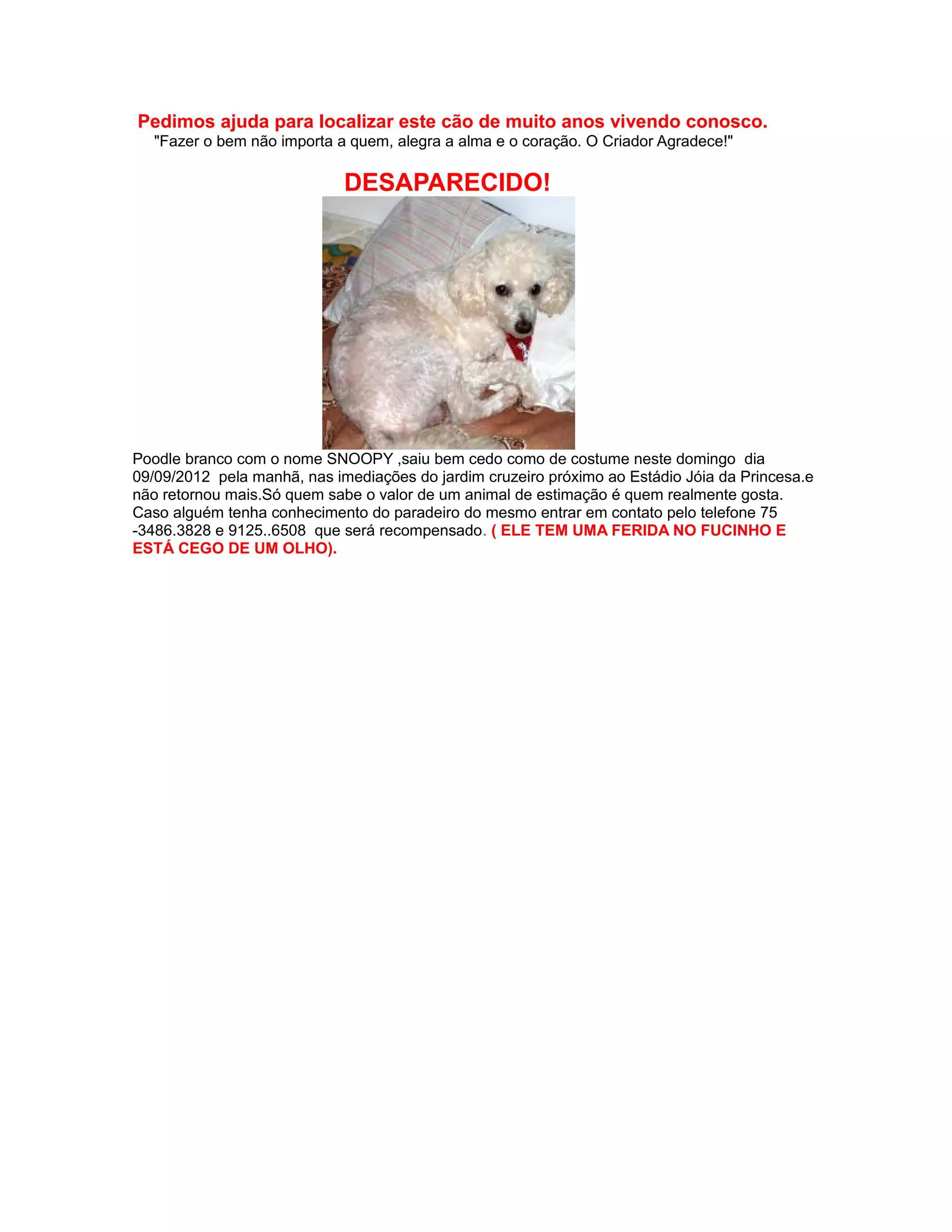 Um poodle branco chamado Snoopy desapareceu no domingo, 9 de setembro de 2012, perto do Jardim Cruzeiro próximo ao Estádio Jóia da Princesa. Ele tem uma ferida no focinho e é cego de um olho. Quem tiver informações sobre seu paradeiro, entre em contato pelos números de telefone fornecidos para que possa ser recompensado.