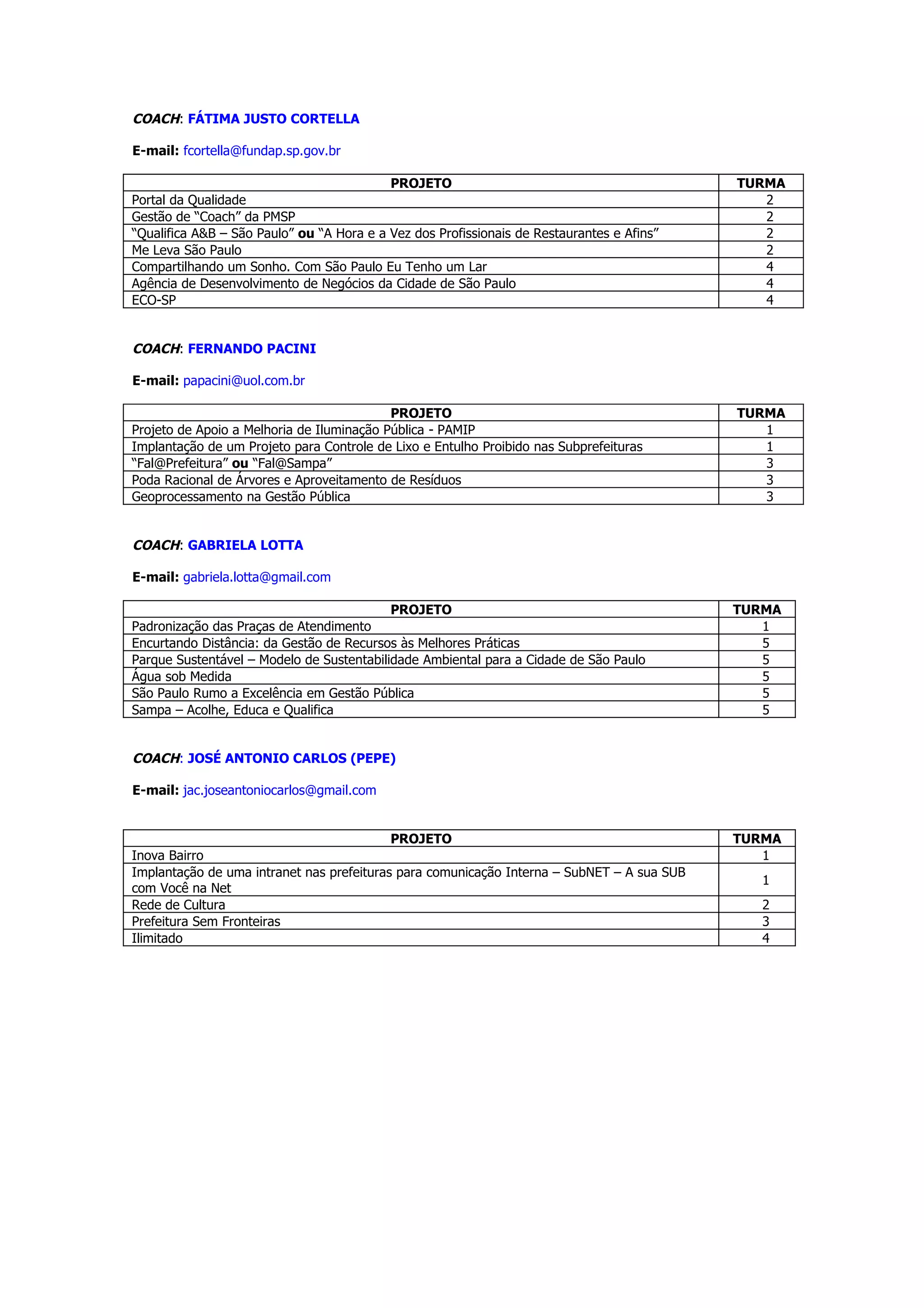 O documento lista projetos e turmas de três coaches: Fátima Justo Cortella, Fernando Pacini e Gabriela Lotta. Cada coach supervisiona entre 2 a 5 projetos relacionados a gestão pública, qualidade, sustentabilidade e serviços à população em diferentes turmas.