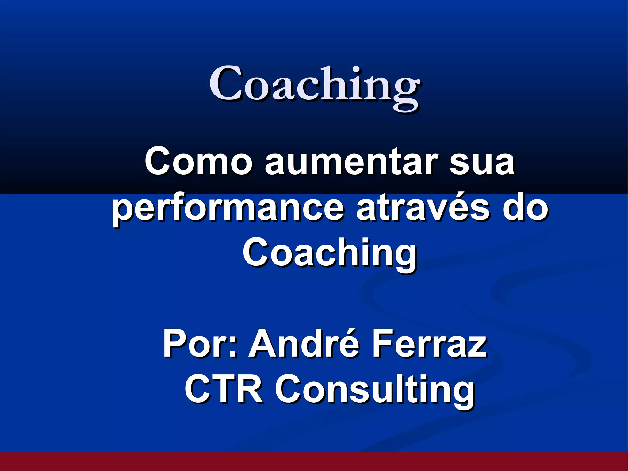 O documento discute como o coaching pode aumentar o desempenho por meio do foco nos objetivos, feedback e desenvolvimento de habilidades. O coaching envolve identificar desafios e objetivos, pontos fortes e áreas para melhoria, estimulando a ação. Ferramentas como FARM, SMART e CRIE-PE ajudam a definir objetivos específicos, mensuráveis e alcançáveis.