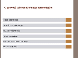 O documento discute o coaching como uma ferramenta para desenvolver habilidades para o sucesso. Ele explica o que é coaching, seus benefícios e vantagens, pilares, tipos de coaching e ética na prática. No final, convida o leitor interessado a entrar em contato para agendar uma sessão.