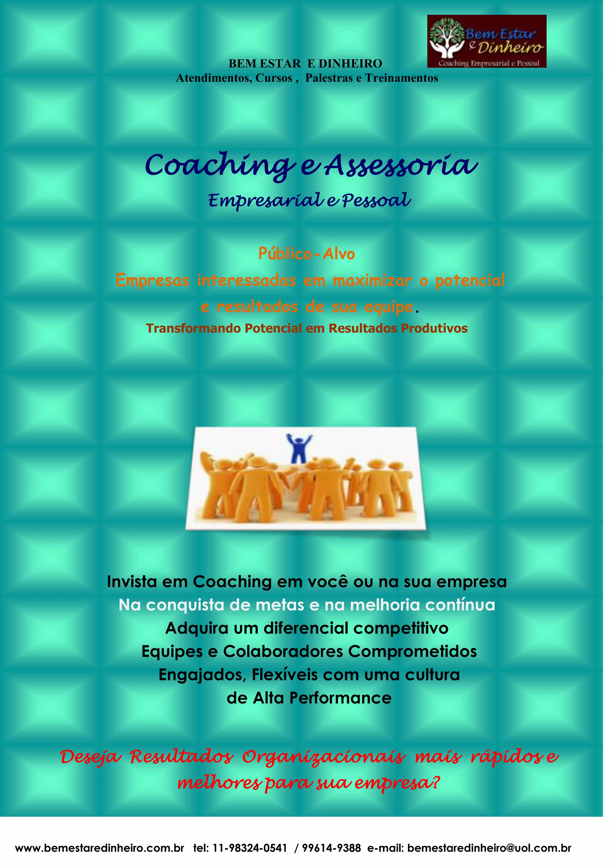 O documento descreve os serviços de coaching e assessoria empresarial e pessoal oferecidos pela empresa Bem Estar e Dinheiro, incluindo atendimentos, cursos, palestras e treinamentos. O foco é ajudar empresas a maximizar o potencial e resultados de suas equipes por meio do desenvolvimento individual e em equipe. O coaching de equipes busca alavancar o desempenho do time para atingir altos níveis de produtividade e resultados.