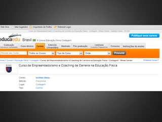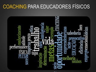O documento apresenta um curso de coaching voltado para educadores físicos, enfocando a importância de desenvolver habilidades, competência e inteligência emocional para ter sucesso na profissão. Destaca a diferença entre coaching e outras práticas, e oferece dicas sobre como se adaptar e prosperar em um mercado em mudança. A mensagem central é a transformação pessoal e profissional por meio de ações práticas e um mindset positivo.