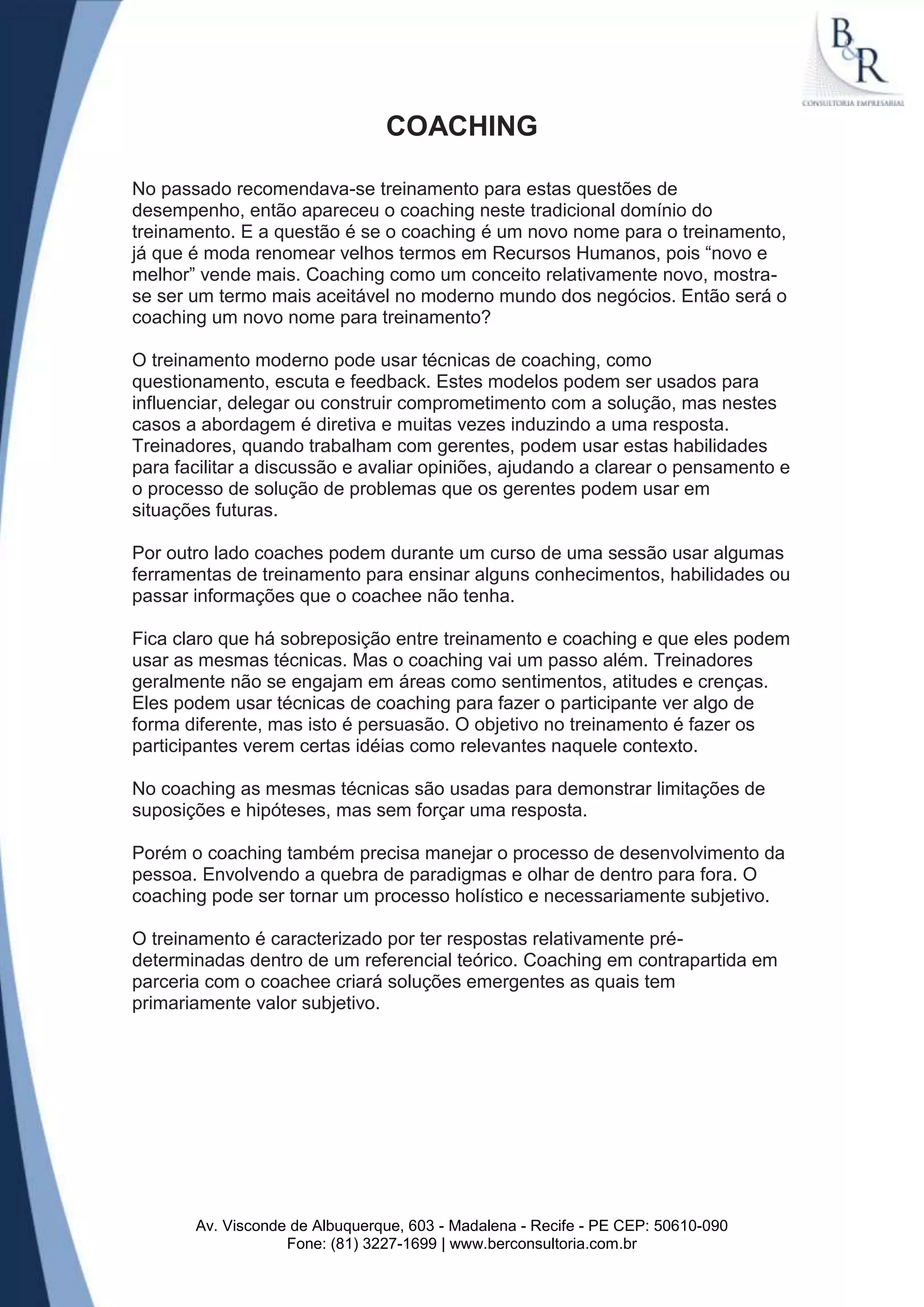 Treinamento e coaching possuem técnicas similares como questionamento e escuta ativa, mas diferem em seus objetivos e abordagens. O treinamento tem respostas predeterminadas e foca em conhecimento, enquanto o coaching é centrado na pessoa e ajuda a definir soluções subjetivas para questões complexas. Embora haja sobreposição, coaching não é apenas um novo nome para treinamento, pois envolve também aspectos como sentimentos e crenças individuais.