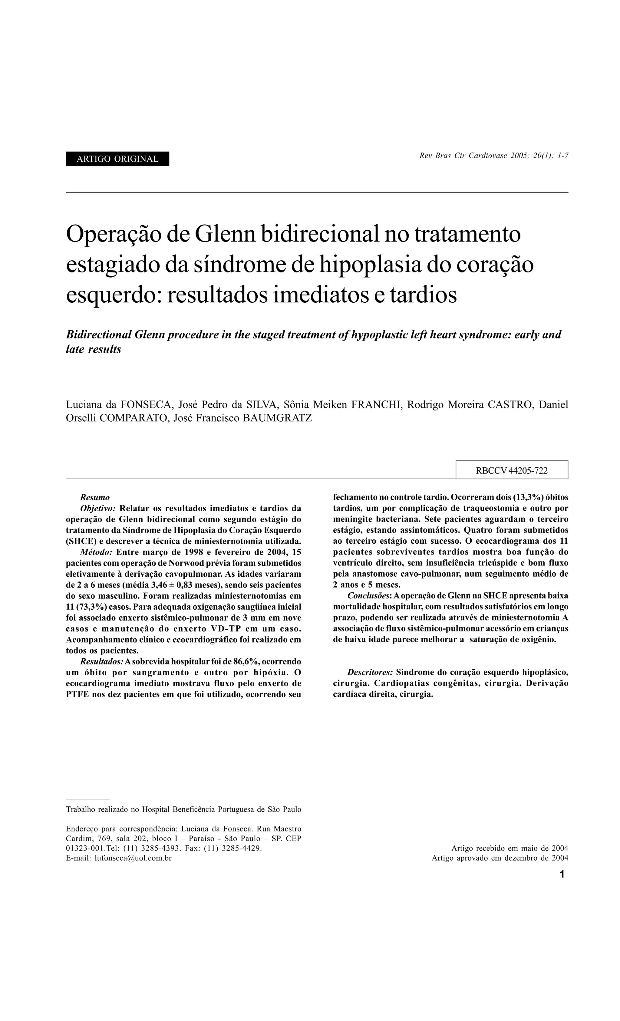 Este artigo descreve os resultados imediatos e tardios da operação de Glenn bidirecional como segundo estágio do tratamento da Síndrome de Hipoplasia do Coração Esquerdo (SHCE) em 15 pacientes. A sobrevida hospitalar foi de 86,6% e os resultados em longo prazo mostraram boa função cardíaca, sem complicações. A operação de Glenn mostrou-se segura e efetiva como tratamento para a SHCE quando realizada em centros experientes.
