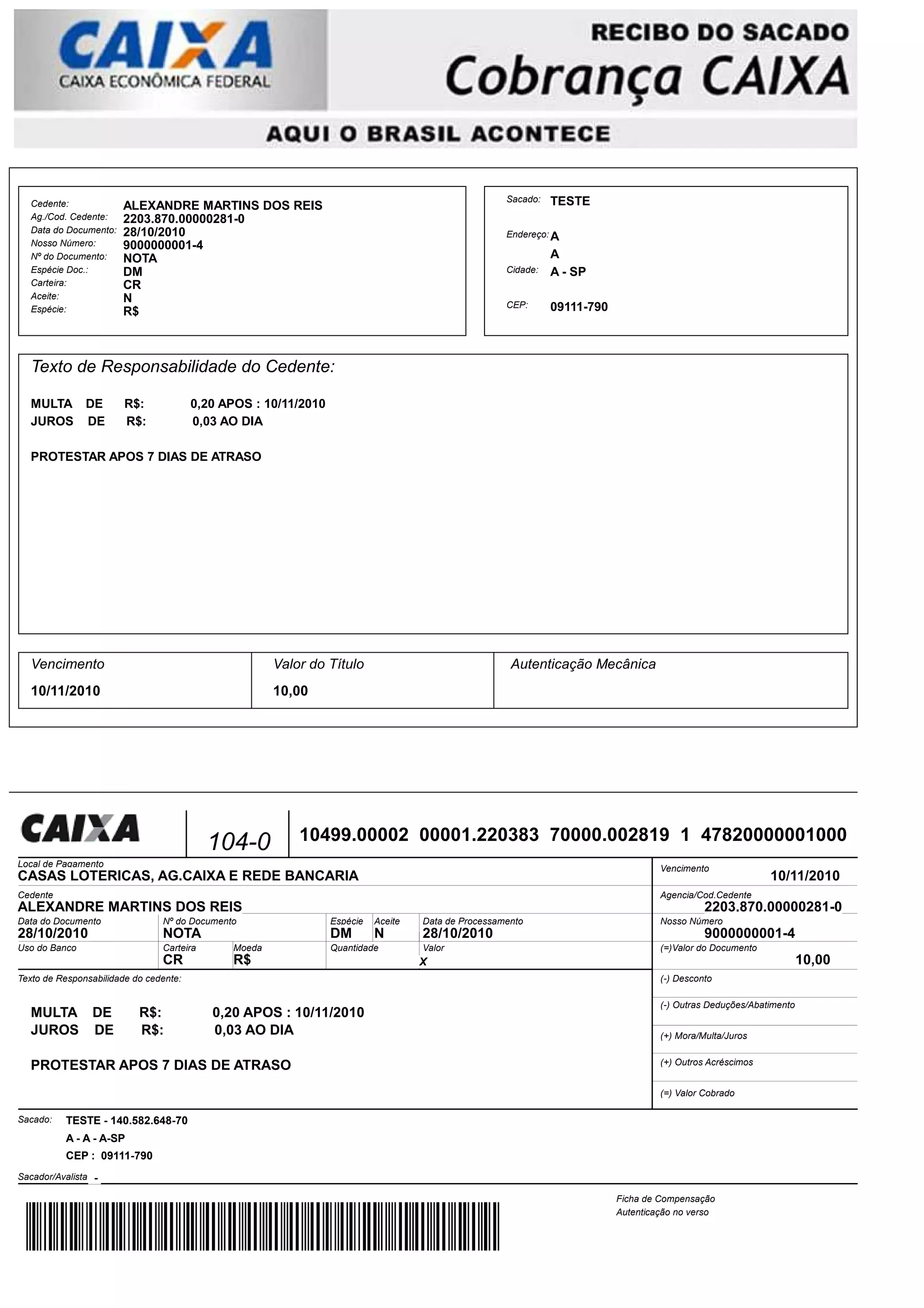 Este documento é uma nota promissória emitida por Alexandre Martins dos Reis para pagar R$10,00 à Teste no vencimento de 10/11/2010, sujeita a multa e juros caso o pagamento seja atrasado.