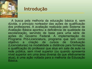 O documento discute a importância da educação a distância e novas tecnologias na formação de professores, considerando aspectos culturais e subjetivos. Aborda como o programa Pró-Licenciatura usa seis eixos para qualificar professores, incluindo conteúdo acadêmico e compreensão do papel social e político dos professores. Também analisa como ferramentas da Web 2.0 podem apoiar aprendizagem colaborativa entre professores.