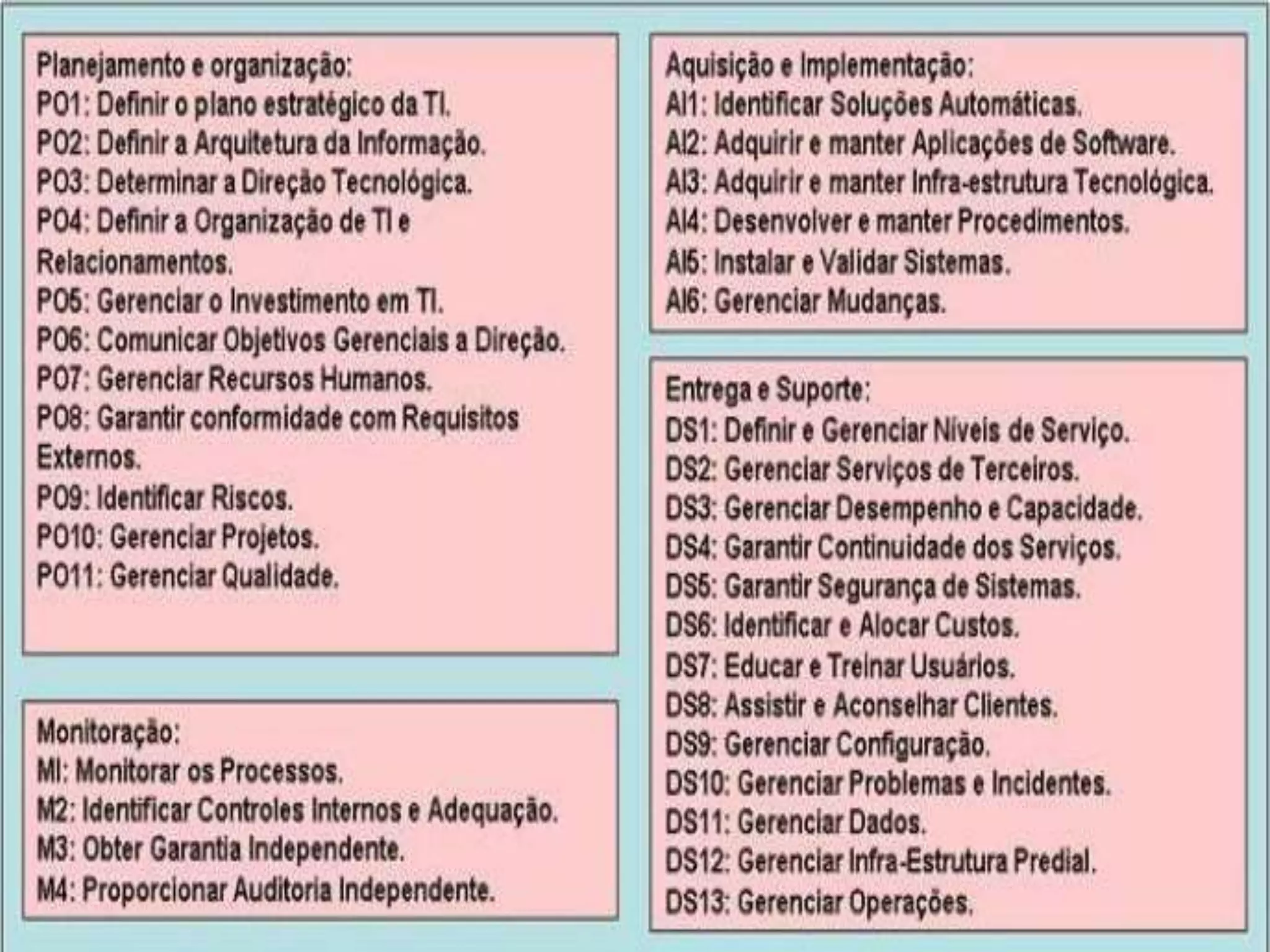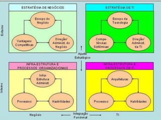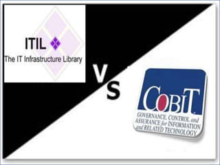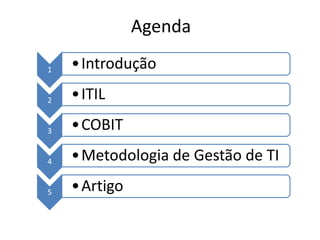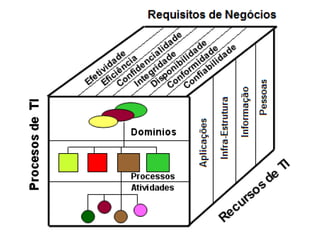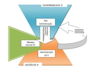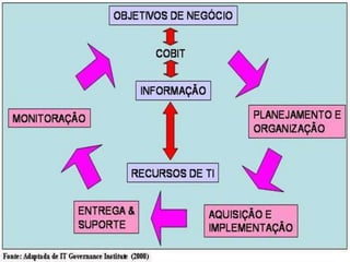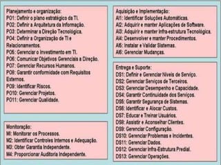 O documento discute conceitos e metodologias relacionadas à governança e gestão de TI, como COBIT e ITIL. O COBIT fornece um framework para gerenciar riscos e alinhar TI à estratégia do negócio, enquanto o ITIL define melhores práticas para gerenciar serviços de TI. Juntos, eles podem ajudar as organizações a melhorar a eficiência e alinhamento estratégico da TI.