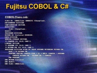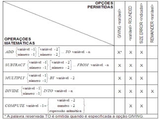 Resumo das CaracterísticasExclusivas do COBOL Os compiladores atuais portam o código COBOL para Macintosh e PCs (DOS, Windows, Linux) e Mainframe. Leitura do código é fácil, porque os comandos são bem próximos ao inglês fluente. Única linguagem que aceita hífens em nomes de variáveis. Comandos para cada operação matemática básica separados, e comando para fórmulas matemáticas As variáveis são divididas por níveis, podendo uma variável ser parte de outra (ver exemplo seguinte)
