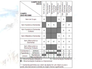 Pictures Indica otipo do campo, seu tamanho, tratamento a ser dado pelo compilador quando usado e como será armazenado na memória. O tipo de um campo, em termos gerais, pode ser: Alfabético : pode conter somente letras maiúsculas ou minúsculas e espaços em branco. O alinhamento do campo é feito pela esquerda, a não ser que seja declarado como JUSTIFIED RIGHT (alinhado a direita). É representado pela Picture “A”. Alfanumérico : este formato de campo aceita qualquer caractere, seja letra, dígito ou outro caractere válido no sistema de representação utilizado no computador em questão (EBCDIC ou ASCII). O alinhamento de campos alfanuméricos é sempre feito pela esquerda, e é representado pela Picture “X”. Numérico : só aceita números e sinal. Caso o campo possua outro tipo de dado, o programa será terminado com erro de execução. O alinhamento de um campo numérico é sempre feito pela direita, ou pela vírgula, quando existir, truncando o número em seus dígitos mais significativos caso o valor ultrapasse o tamanho indicado. O valor máximo que pode ser armazenado não pode ultrapassar 18 dígitos. É representado pela Picture “9”. Estas são apenas as máscaras (Pictures) mais usadas, mas existem outras, complementares a essas, ou para utilizações diferentes das citadas.
