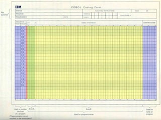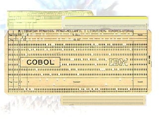 O documento descreve características da linguagem de programação COBOL, incluindo suas divisões, identificadores, literais, constantes figurativas e pictures. Também conta uma história sobre Grace Hopper e a origem do termo "debugging".
