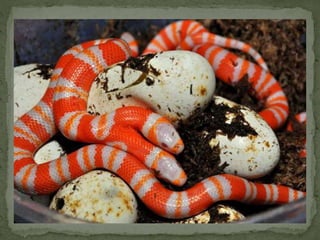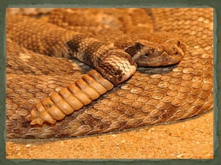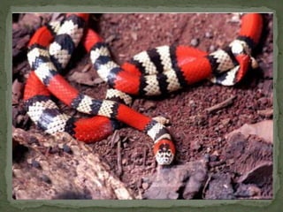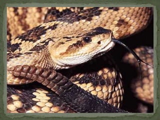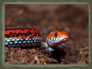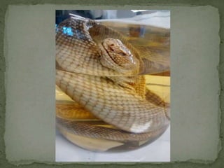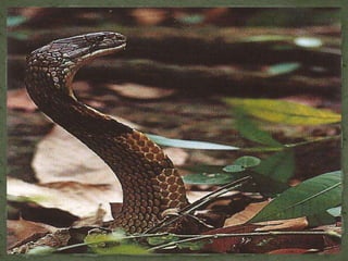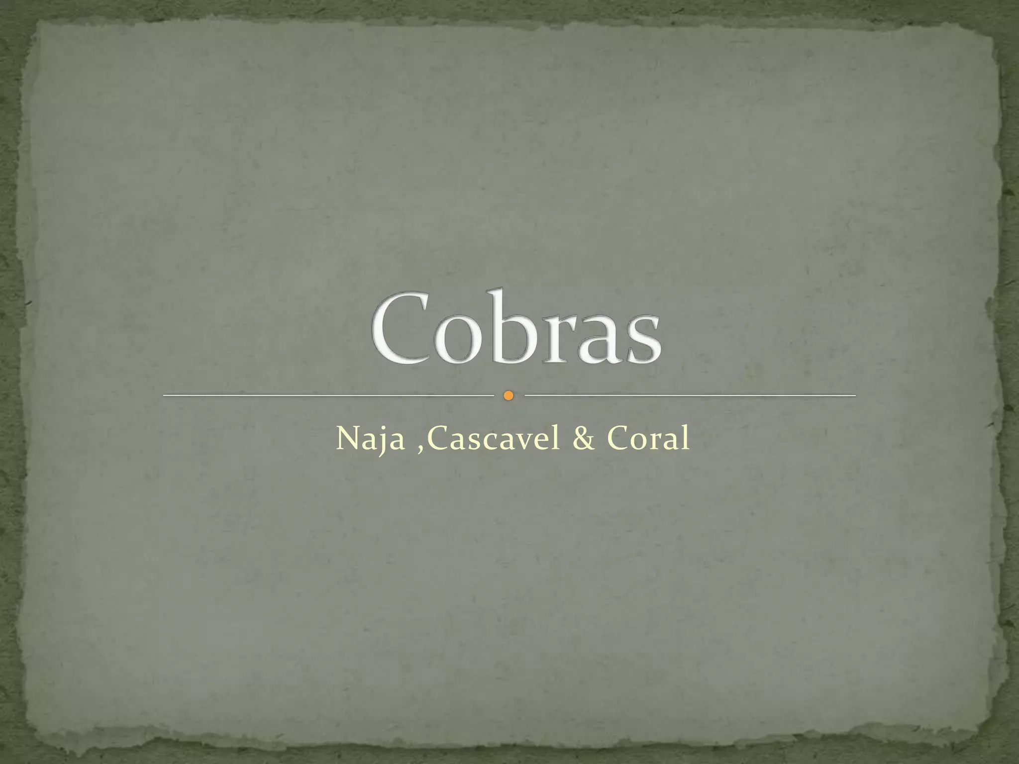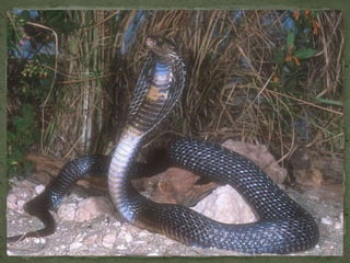 O documento discute três tipos de serpentes: najas, cascavéis e corais. Najas são serpentes venenosas encontradas na África e Ásia que podem elevar o corpo e cuspir veneno. Cascavéis têm um chocalho na cauda e vivem nas Américas. Corais têm cores vivas e existem em parte das Américas, com algumas espécies peçonhentas e outras não.