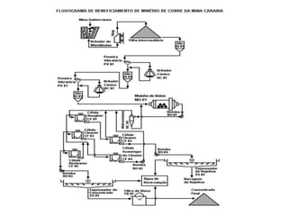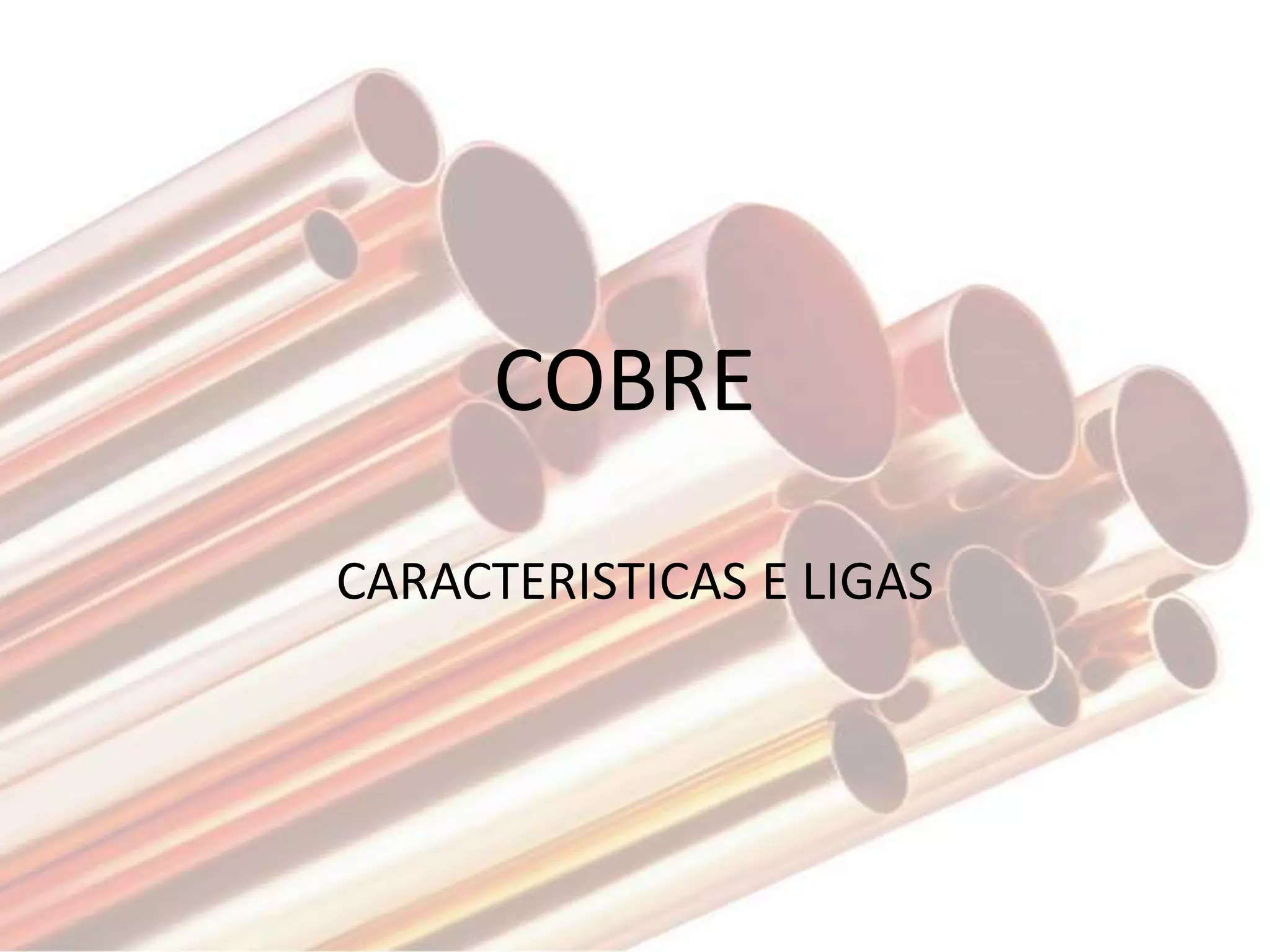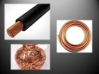 O documento fornece informações sobre o cobre e suas ligas. Resume que o cobre é extraído de minérios como a calcopirita, é refinado em um processo que inclui flotação, fundição e conversão para produzir o metal cobre puro ou ligas de cobre com outros metais. As principais ligas de cobre são latões, bronzes, cuproníquel e alpacas.
