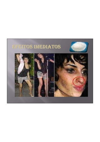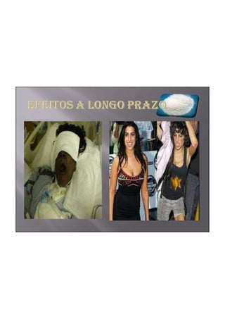 Este documento discute os efeitos da cocaína no corpo humano. Ele descreve como a cocaína afeta o sistema nervoso central, causando euforia e outros efeitos psicológicos e fisiológicos. Também explica como o uso contínuo da cocaína pode levar à dependência e causar danos cerebrais e outros problemas de saúde a longo prazo.