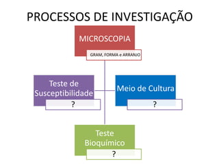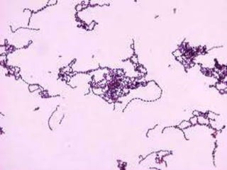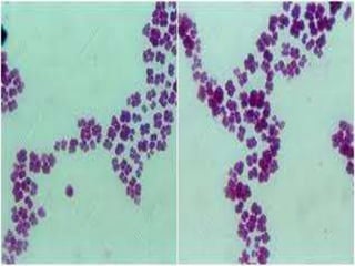 O documento descreve as características morfológicas, bioquímicas e de crescimento de bactérias Gram-positivas de importância clínica, incluindo estafilococos, estreptococos e enterococos. Detalha os principais gêneros e espécies destas bactérias, as doenças causadas e os testes utilizados para sua identificação.