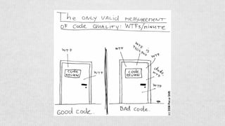 O documento discute princípios de código limpo, incluindo: 1) manter o código livre de más práticas como nomes confusos e métodos longos; 2) seguir a "Regra do escoteiro" de deixar o código melhor do que encontrou; 3) usar testes para medir a qualidade do código.