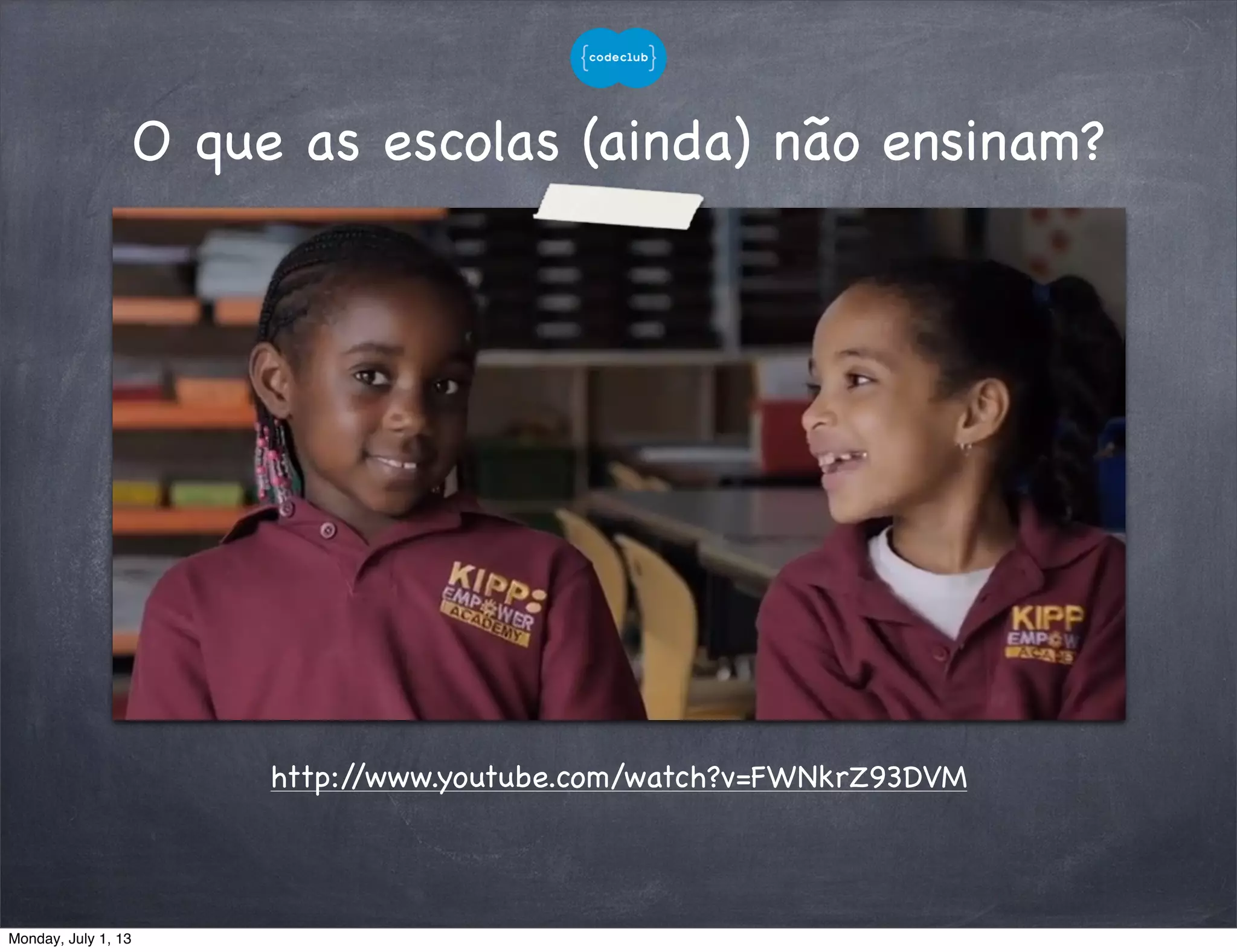 O documento discute a iniciativa CodeClub, originada na Inglaterra, que ensina crianças de 10-11 anos lógica, resolução de problemas e programação usando linguagens como Scratch. O CodeClub oferece cursos gratuitos e materiais online para ensinar conceitos básicos de programação e desenvolvimento web.