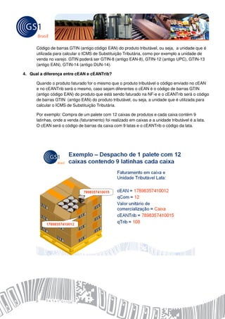 O documento esclarece sobre o GTIN, um identificador global para itens comerciais que pode ter 8, 12, 13 ou 14 dígitos, e seu uso na fatura eletrônica (NF-e). Também define os termos CEAN e CEANTrib, que se referem a códigos de barras GTIN utilizados para identificar produtos faturados e tributáveis, respectivamente. Além disso, discute a obrigatoriedade de associação à GS1 Brasil para atribuição do GTIN e os benefícios de sua inclusão na NF-e.