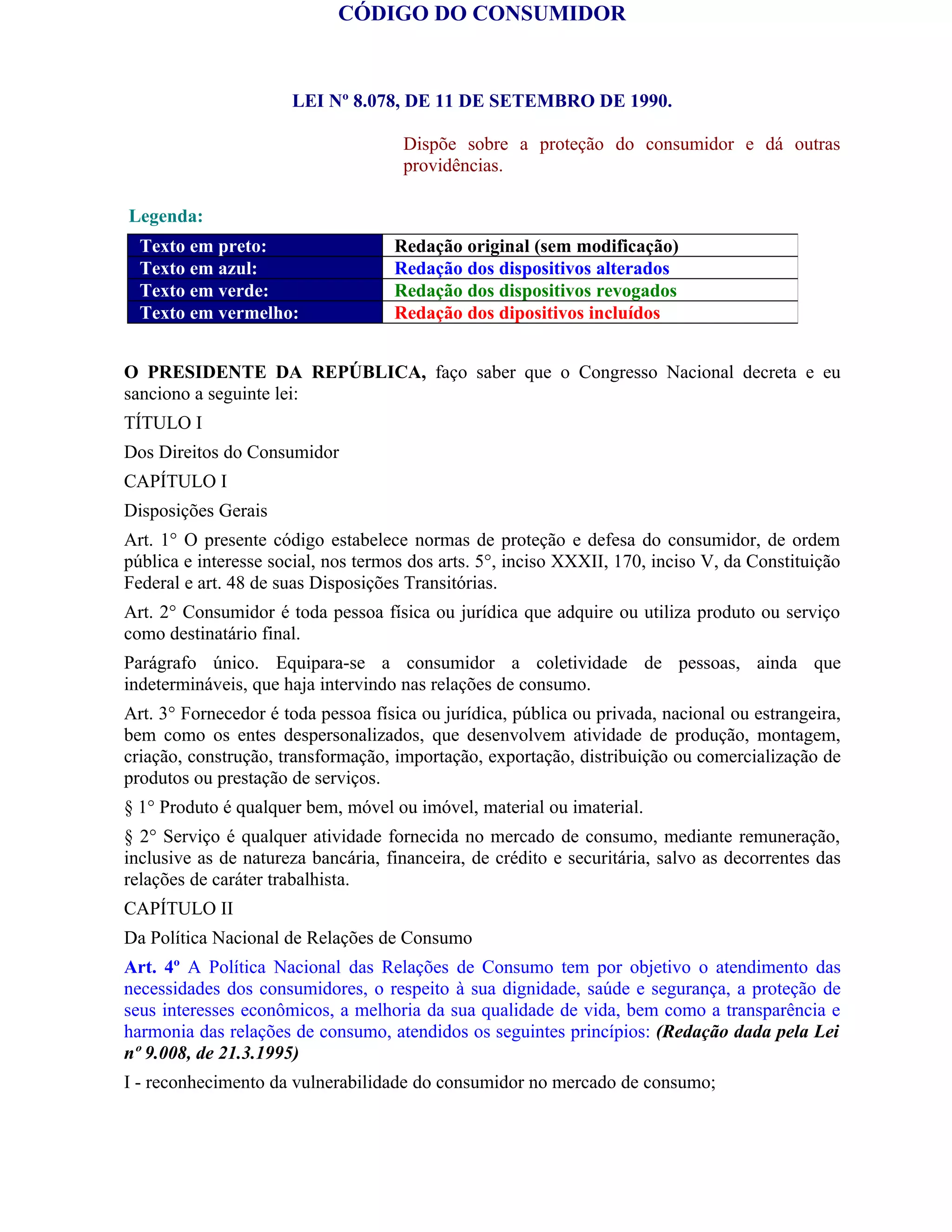 Este documento apresenta o Código do Consumidor brasileiro, estabelecendo normas de proteção e defesa do consumidor. Ele define os direitos básicos do consumidor, como proteção da vida e saúde, informações adequadas, proteção contra publicidade enganosa. Também trata da responsabilidade dos fornecedores por danos causados por defeitos em produtos e serviços, e por vícios que os tornem impróprios para o consumo.