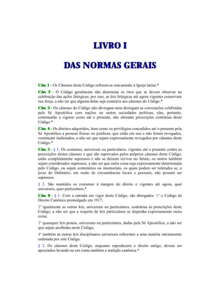 Este documento apresenta os primeiros capítulos do Código de Direito Canônico de 1983, definindo normas gerais sobre leis e costumes eclesiásticos. Os cânones 1-6 descrevem as leis a que se refere o Código e como ele se relaciona com leis e costumes anteriores. Os cânones 7-22 tratam de temas como promulgação, vigência e interpretação das leis eclesiásticas.