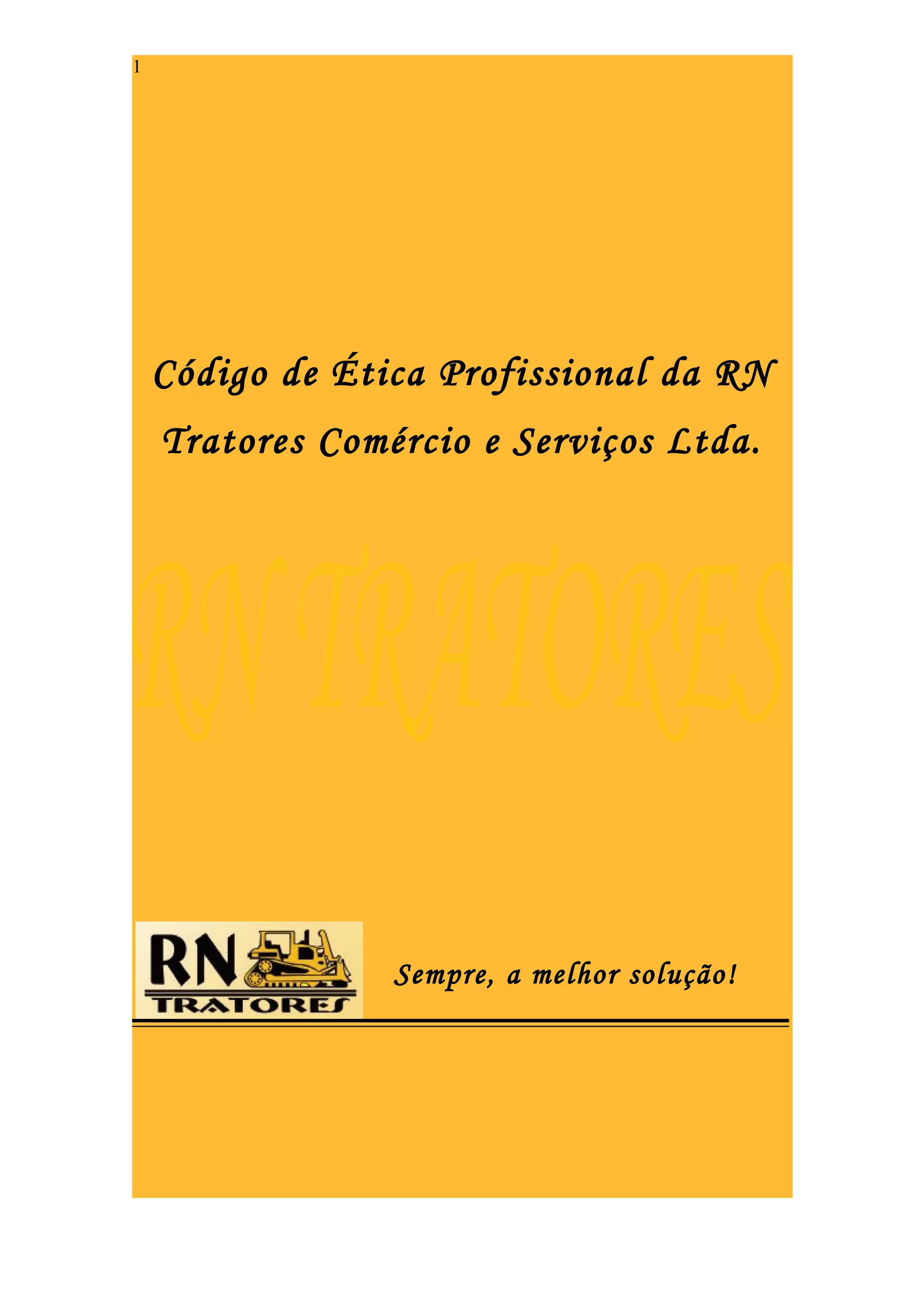 Este documento apresenta o código de ética da empresa RN Tratores Comércio e Serviços Ltda., definindo padrões de conduta profissional para os colaboradores, políticas de relacionamento com fornecedores, clientes, concorrentes e órgãos públicos, além de diretrizes sobre uso de ativos, informações confidenciais e meio ambiente.