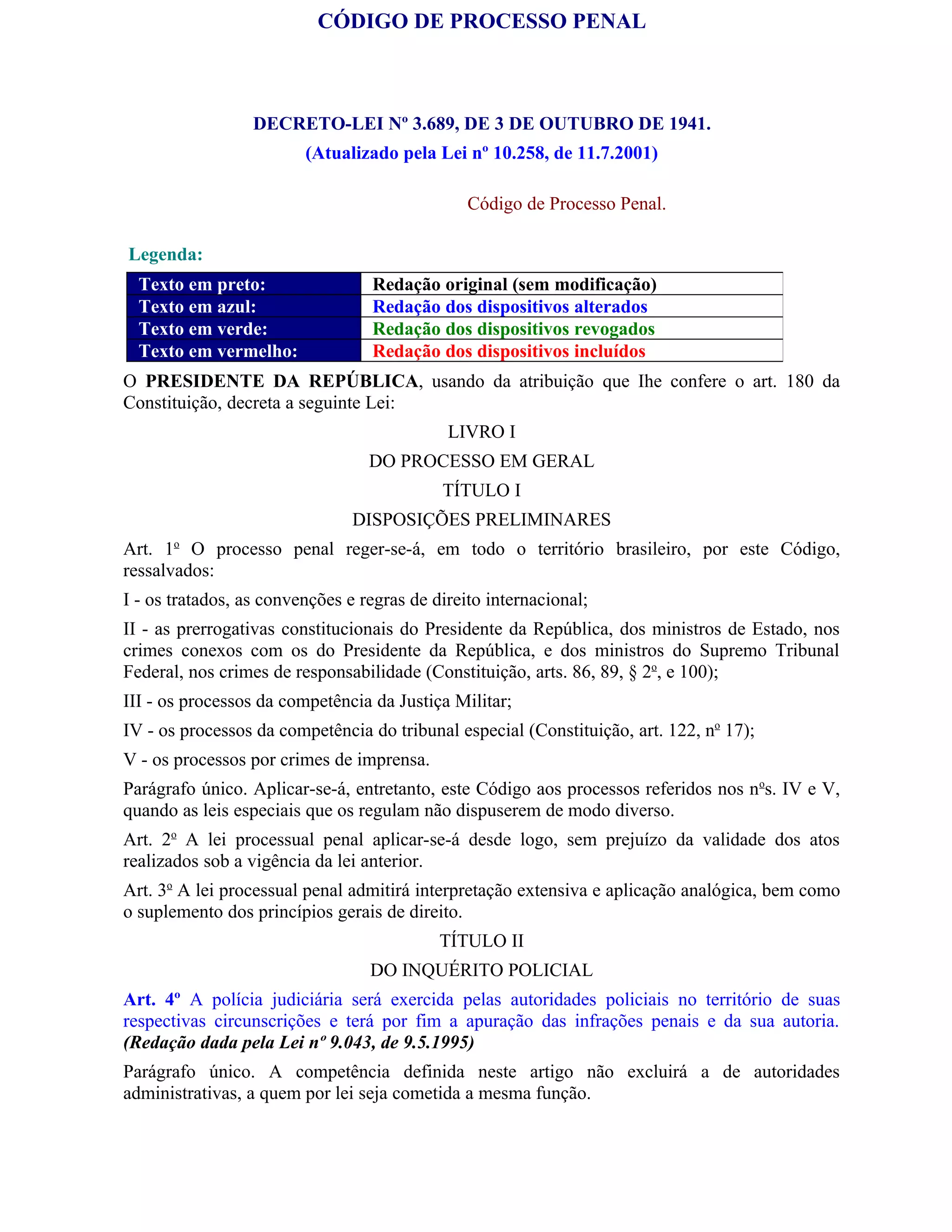 Este documento apresenta o Código de Processo Penal brasileiro, decretado em 1941 e atualizado em 2001. Ele estabelece as normas gerais do processo penal no país, incluindo disposições sobre inquérito policial, ação penal, competência das autoridades e direitos dos envolvidos.