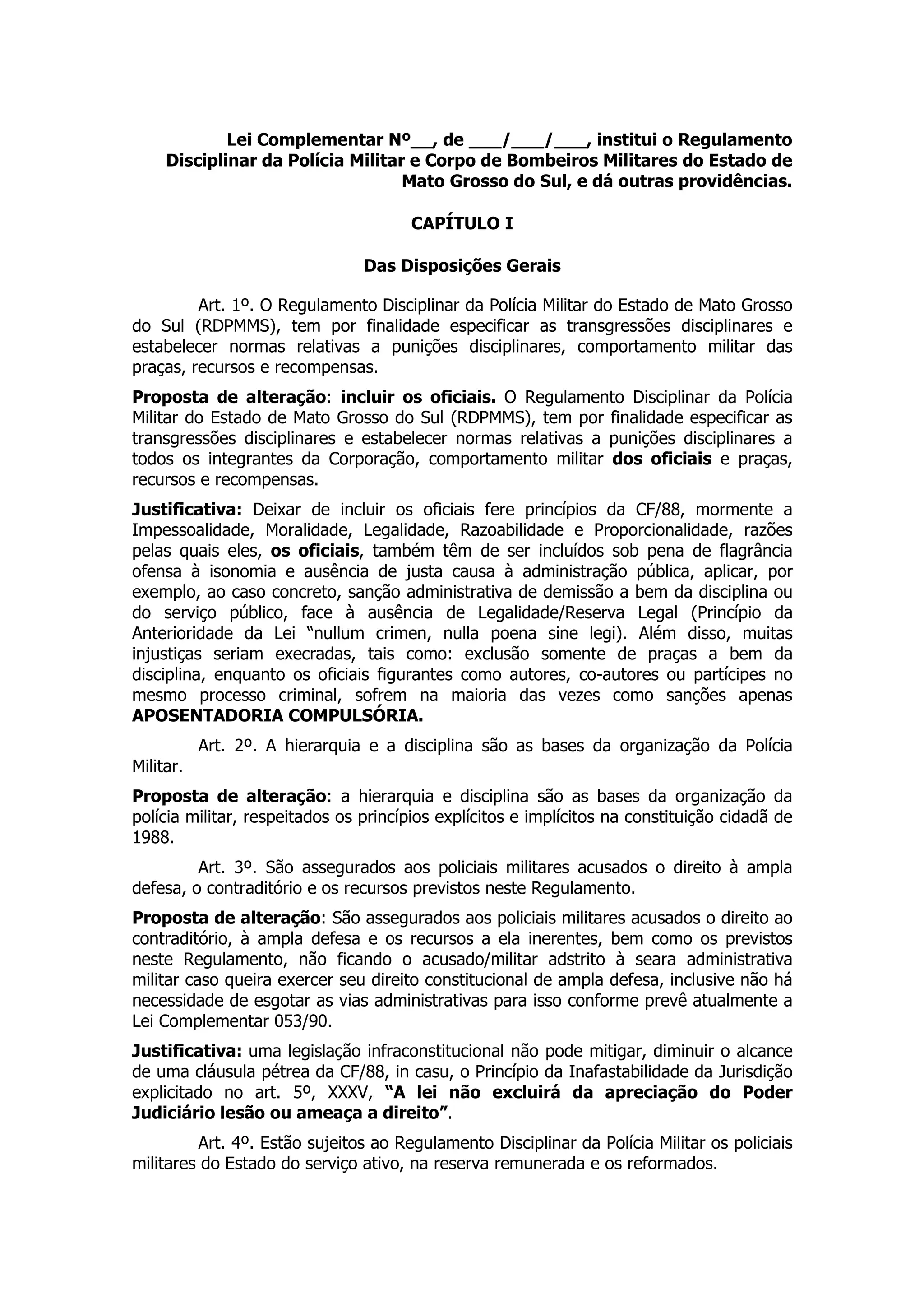 Este documento propõe alterações ao Regulamento Disciplinar da Polícia Militar de Mato Grosso do Sul para (1) incluir os oficiais nas normas disciplinares, (2) garantir os direitos constitucionais dos policiais acusados, e (3) esclarecer conceitos como lealdade e preparo para evitar interpretações equivocadas que possam levar a punições injustas.