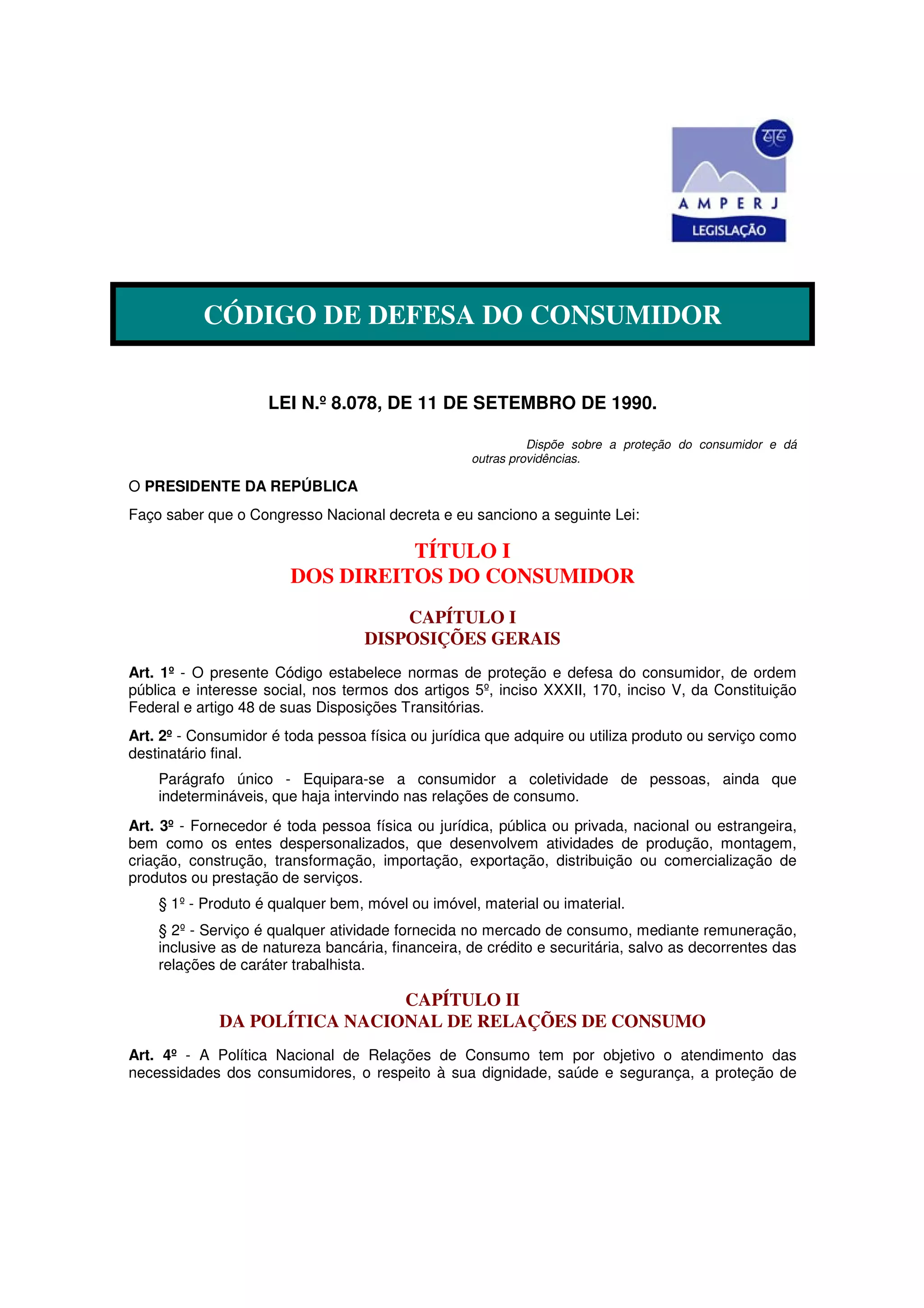 Este documento apresenta o Código de Defesa do Consumidor brasileiro, que estabelece normas de proteção e defesa do consumidor. Ele define os direitos básicos do consumidor, como informações adequadas, proteção contra práticas enganosas e reparação de danos. Também determina a responsabilidade dos fornecedores por defeitos e vícios em produtos e serviços que possam causar danos aos consumidores.