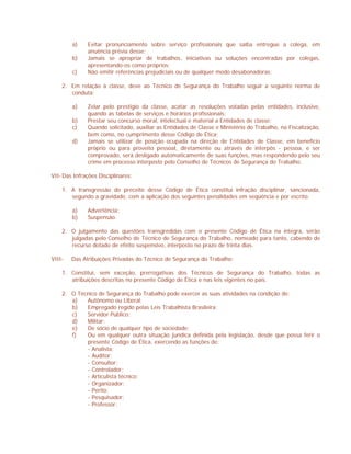 O documento apresenta o Código de Ética Profissional do Técnico de Segurança do Trabalho, definindo seus deveres e proibições, como zelar pela segurança no trabalho, não facilitar o exercício da profissão para não habilitados e manter sigilo profissional. Também estabelece normas para publicações, perícias, honorários, conduta com colegas e atribuições privadas.