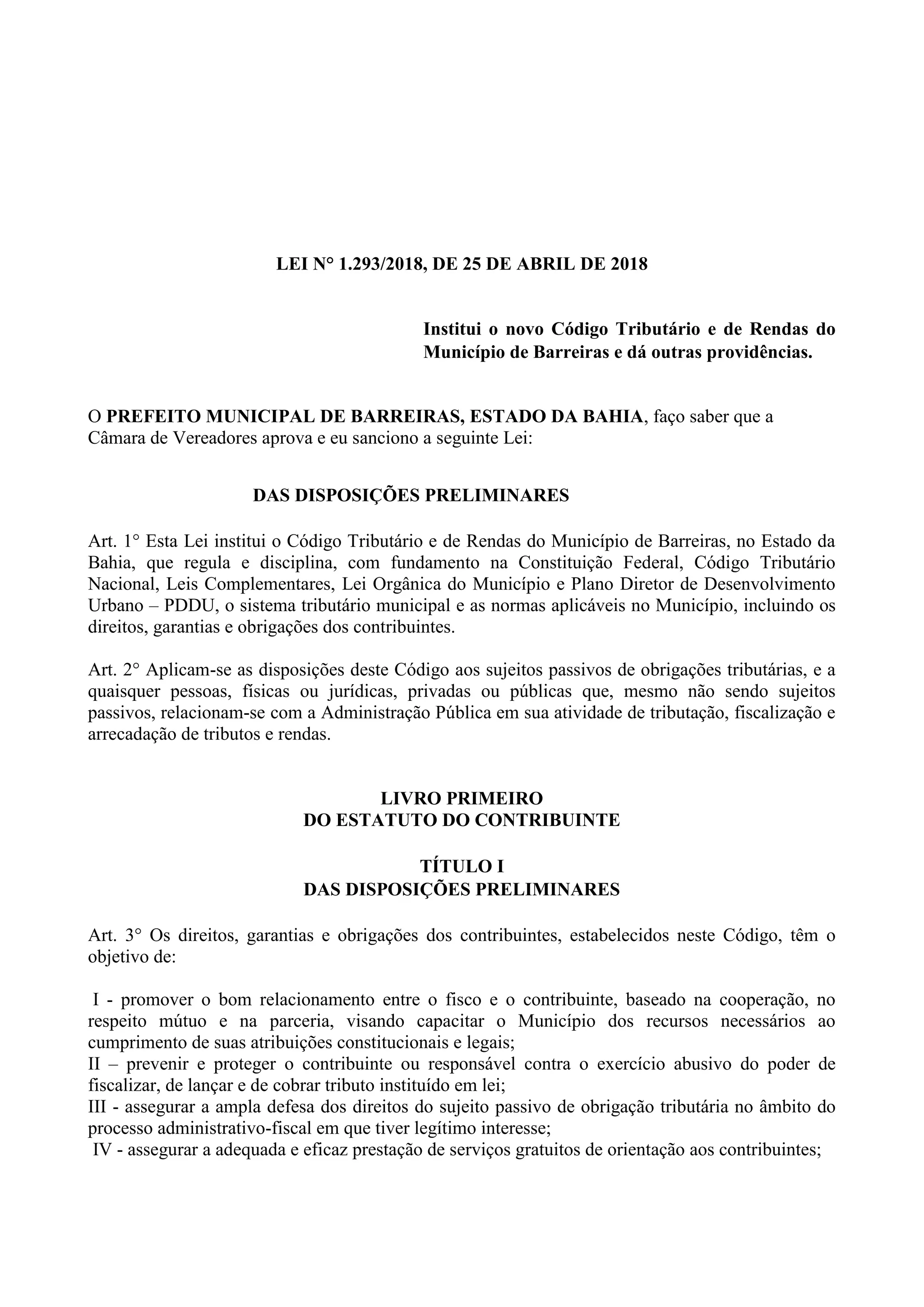 Este documento estabelece o novo Código Tributário e de Rendas do município de Barreiras, na Bahia. O código regulamenta o sistema tributário municipal, incluindo direitos, garantias e obrigações dos contribuintes, e normas aplicáveis no município.