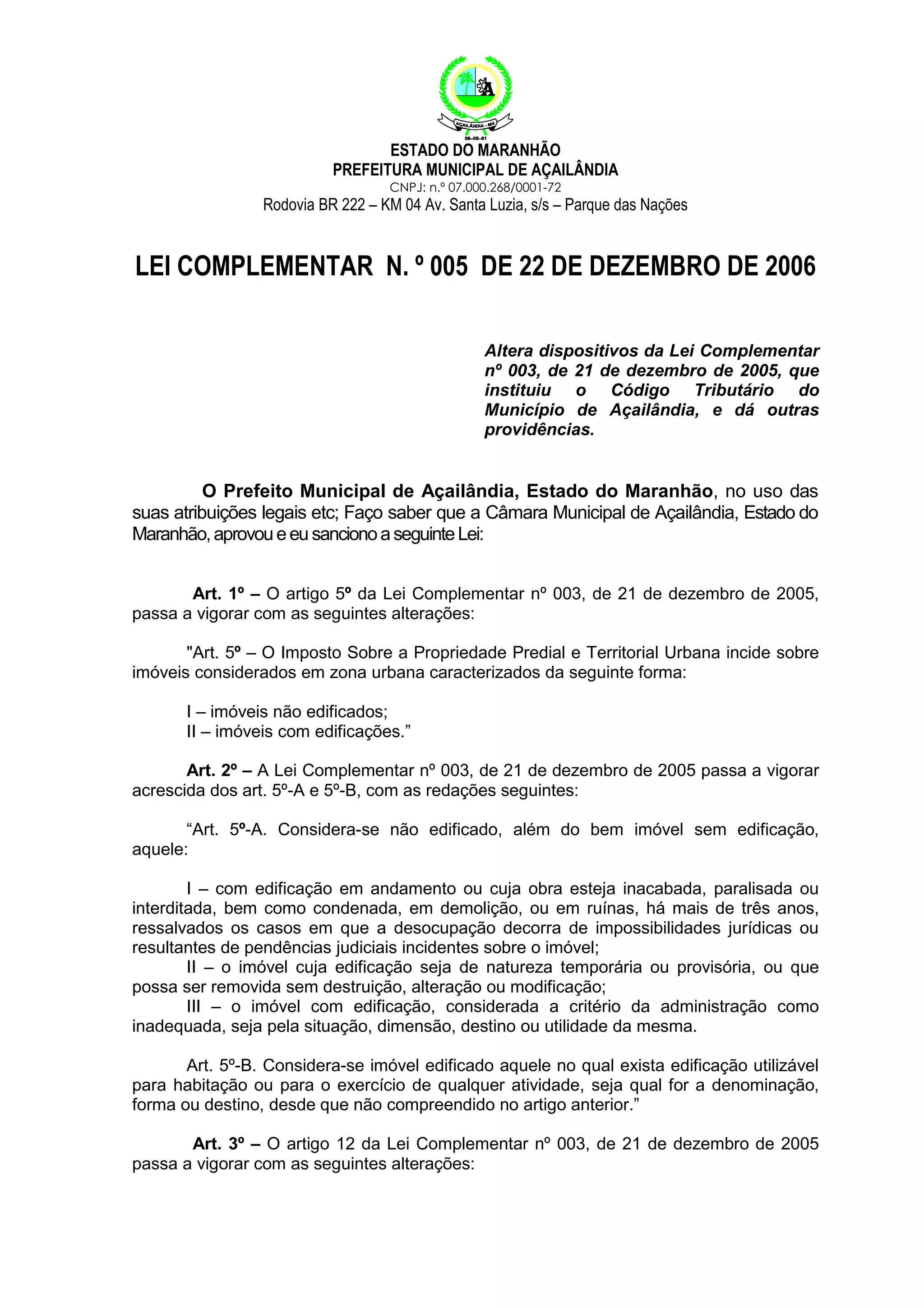 Esta lei complementar altera dispositivos da Lei Complementar no 003 de 2005 que instituiu o Código Tributário do município de Açailândia. As principais alterações incluem: 1) nova definição de imóveis edificados e não edificados para fins de IPTU; 2) alterações nas alíquotas do IPTU levando em conta a localização e valor venal dos imóveis; 3) acréscimos de prazos e penalidades para débitos tributários atrasados.
