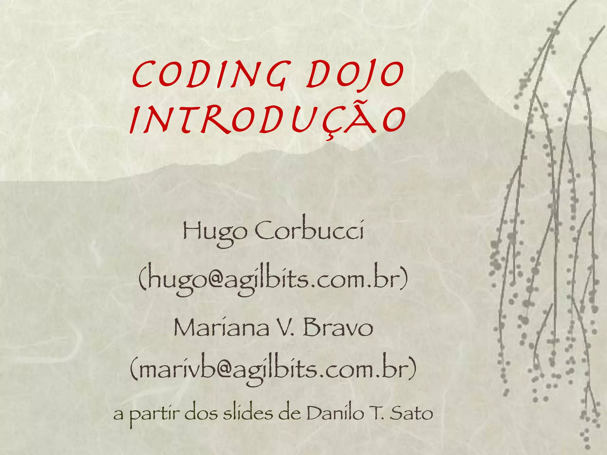 O documento apresenta os princípios e formatos do Coding Dojo, que tem como objetivo praticar programação de forma colaborativa e segura para aprender continuamente. Os participantes programam em pares ou em grupo, recebendo feedback, e o foco é resolver problemas de programação de forma iterativa usando testes.