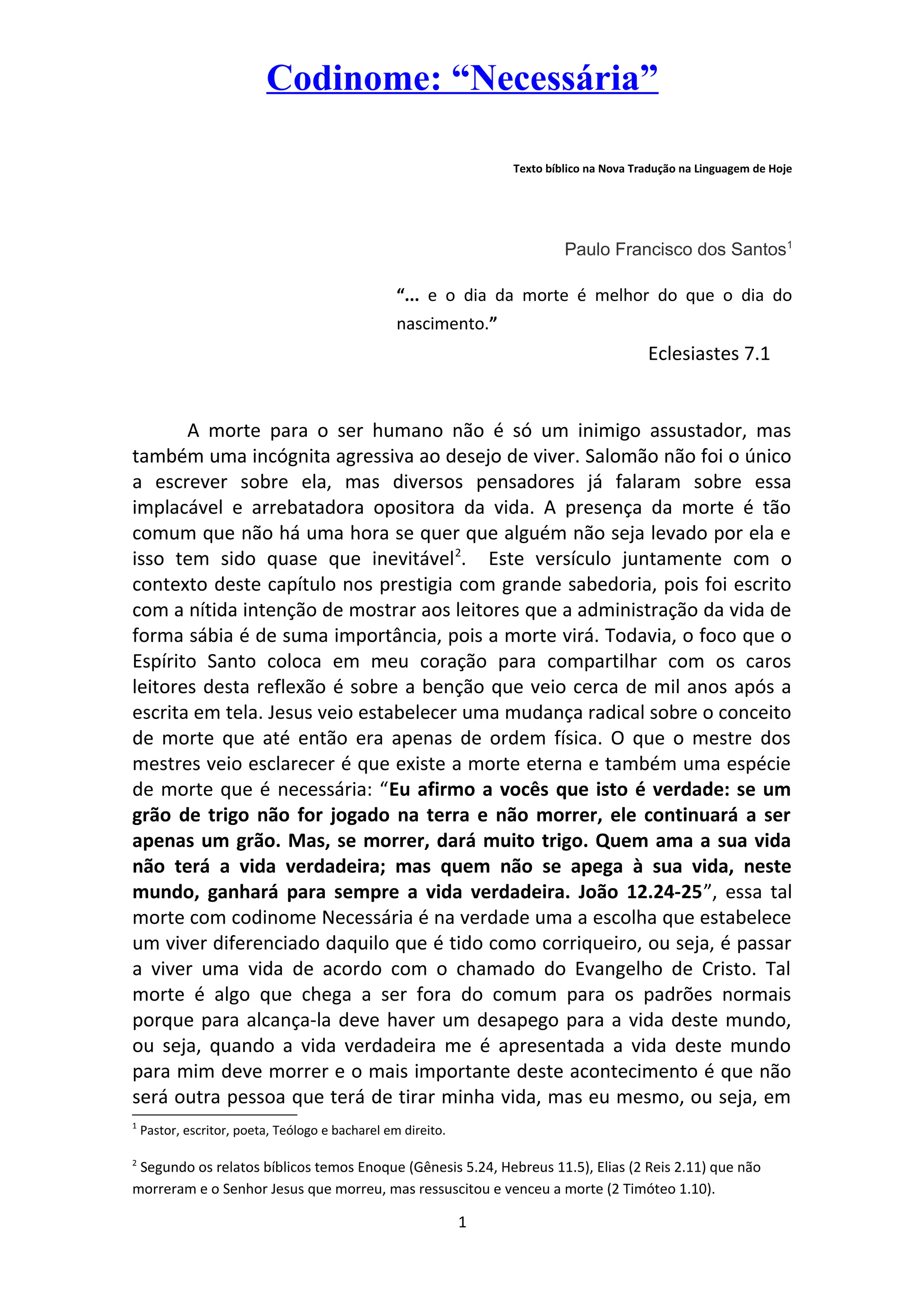 Este documento discute a "morte necessária" mencionada no versículo bíblico de Eclesiastes 7:1. A morte necessária é uma escolha de viver de acordo com o evangelho de Cristo, desapegando-se da vida terrena em favor da vida eterna com Deus. Ao contrário da morte física comum, a morte necessária é um suicídio figurado da natureza pecaminosa do homem em troca da filiação divina.
