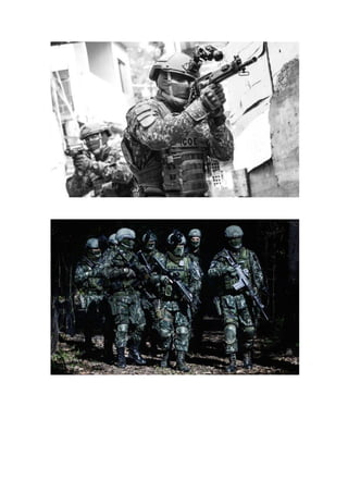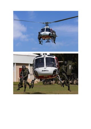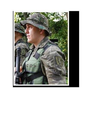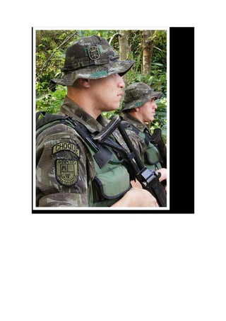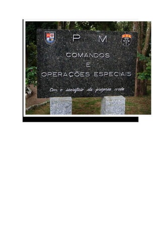 O documento descreve a história e as operações da Companhia de Comandos e Operações Especiais (COE) da Polícia Militar de São Paulo. A COE foi formada na década de 1970 para lidar com o aumento do terrorismo e atua em missões de alto risco, como resgates, combate a crimes organizados e rebeliões em prisões. Os membros da COE passam por um treinamento rigoroso e operam em diferentes ambientes como selva, montanha e mar.