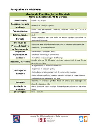 Este documento descreve uma atividade realizada na sala do Pião da EB1/JI de Ouressa com alunos com Necessidades Educativas Especiais. A atividade teve como objetivos desenvolver o gosto pela leitura, promover a socialização entre alunos e sensibilizar para as vantagens da diferença. Os alunos ouviram uma canção, exploraram a letra com gestos, decoraram ovos de papel e os enfeitaram com fita.
