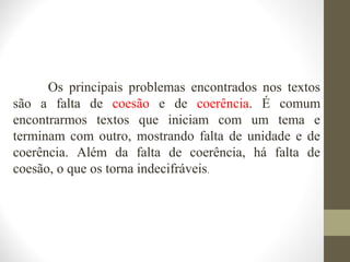 O documento discute a importância da coerência e coesão em textos. A coerência refere-se à manutenção do mesmo tema ao longo do texto, enquanto a coesão refere-se às conexões entre frases e parágrafos por meio de referências e conectores. Textos incoerentes ou desconexos dificultam a compreensão.