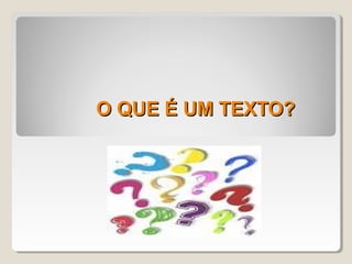O documento discute os conceitos de texto, coesão e coerência. Define texto como uma unidade linguística com propriedades estruturais específicas e não apenas uma sequência de frases isoladas. Apresenta os elementos responsáveis pela textualidade como coesão, coerência, informatividade, situacionalidade, intertextualidade, intencionalidade e aceitabilidade. Explora os mecanismos de coesão como referencial, elipse, lexical e substituição.