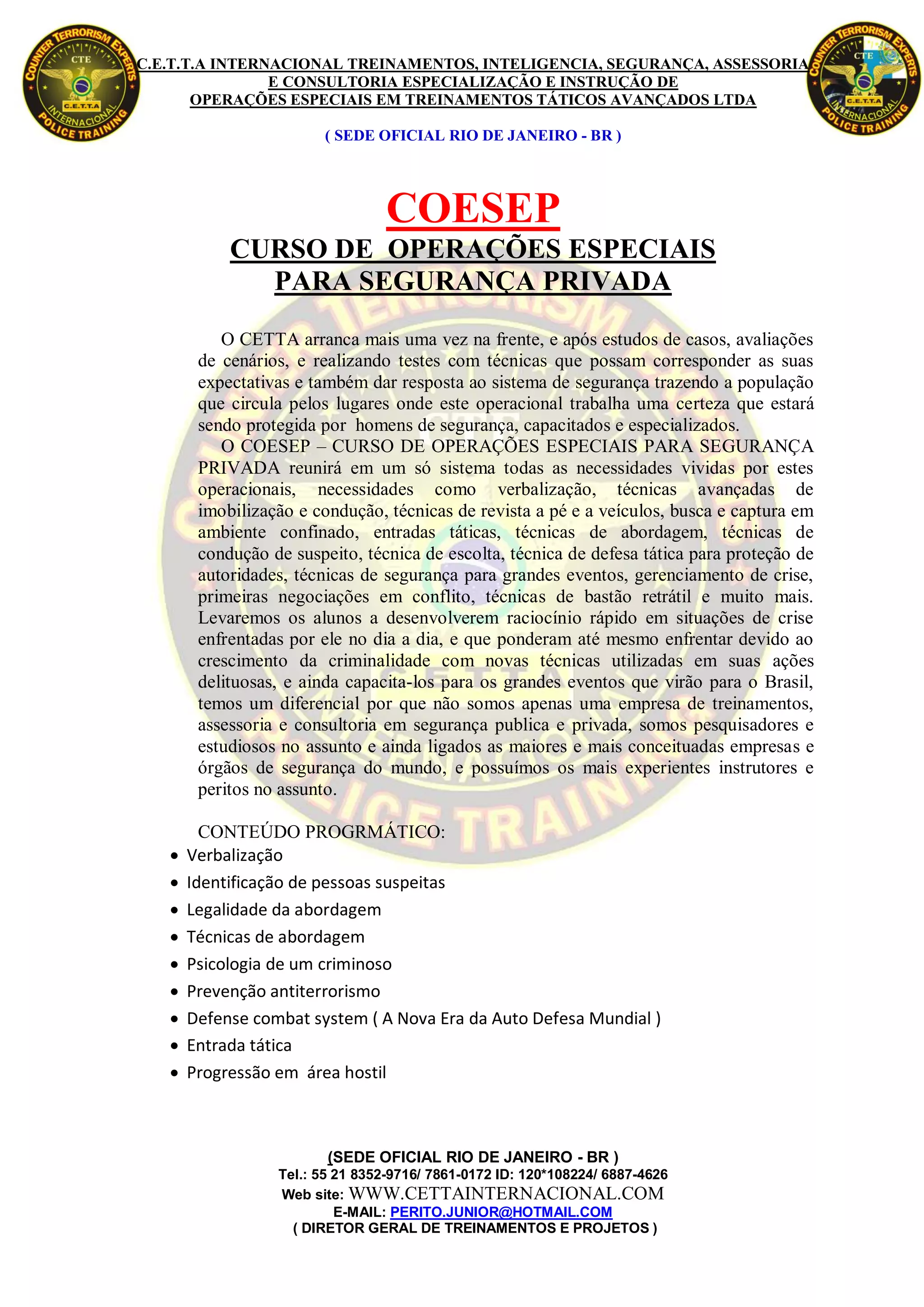 O documento descreve um curso de operações especiais para segurança privada oferecido pela CETTA Internacional, cobrindo tópicos como abordagem, imobilização, defesa pessoal e resposta a crises. O curso de 4 dias ensina técnicas avançadas para que profissionais de segurança possam lidar melhor com situações de risco.