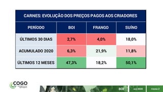 O documento analisa as tendências de preços da carne bovina, suína e de frango no Brasil. Aponta que os preços destas carnes tiveram altas significativas nos últimos 30 dias e 12 meses, devido à oferta restrita e forte demanda interna e externa. Prediz que a tendência é de manutenção dos preços elevados nos próximos meses, à medida que a oferta se mantenha limitada.