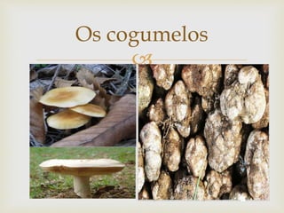 Este documento descreve as características de dois tipos de cogumelos: o Frade ou Púcara e as Túberas. O Frade ou Púcara tem um chapéu oval quando jovem que fica convexo com a idade, e um pé branco que fica rosado ou acastanhado quando amadurece. As Túberas surgem na primavera e crescem em terrenos argilosos com areia.