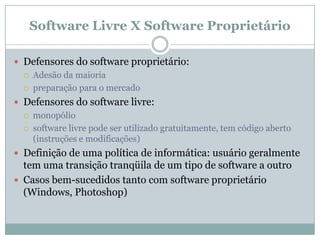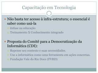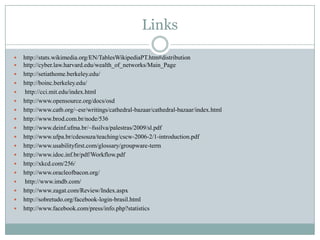 O documento discute os conceitos de colaboração, sistemas de informação colaborativos e comunidades online. Apresenta definições e exemplos de Web 2.0, software livre, wikis, groupware e workflow. Explora as vantagens e desvantagens destes sistemas e classificações como ad hoc, administrativo e baseado em produção.
