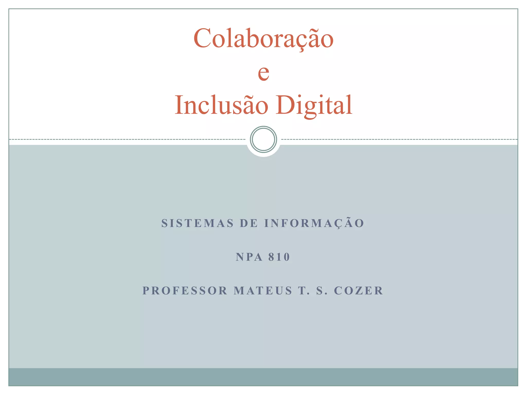 O documento discute os conceitos de colaboração, sistemas de informação colaborativos e comunidades online. Apresenta definições e exemplos de Web 2.0, software livre, wikis, groupware e workflow. Explora as vantagens e desvantagens destes sistemas e classificações como ad hoc, administrativo e baseado em produção.
