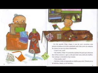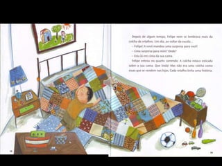A história conta a história de uma vovó que faz uma colcha de retalhos para presentear a neta. A colcha é feita com pedaços de tecidos coloridos que representam momentos especiais e pessoas importantes para a vovó. A neta recebe o presente especial da vovó e passa a valorizar ainda mais o carinho colocado em cada pedaço da colcha de retalhos.