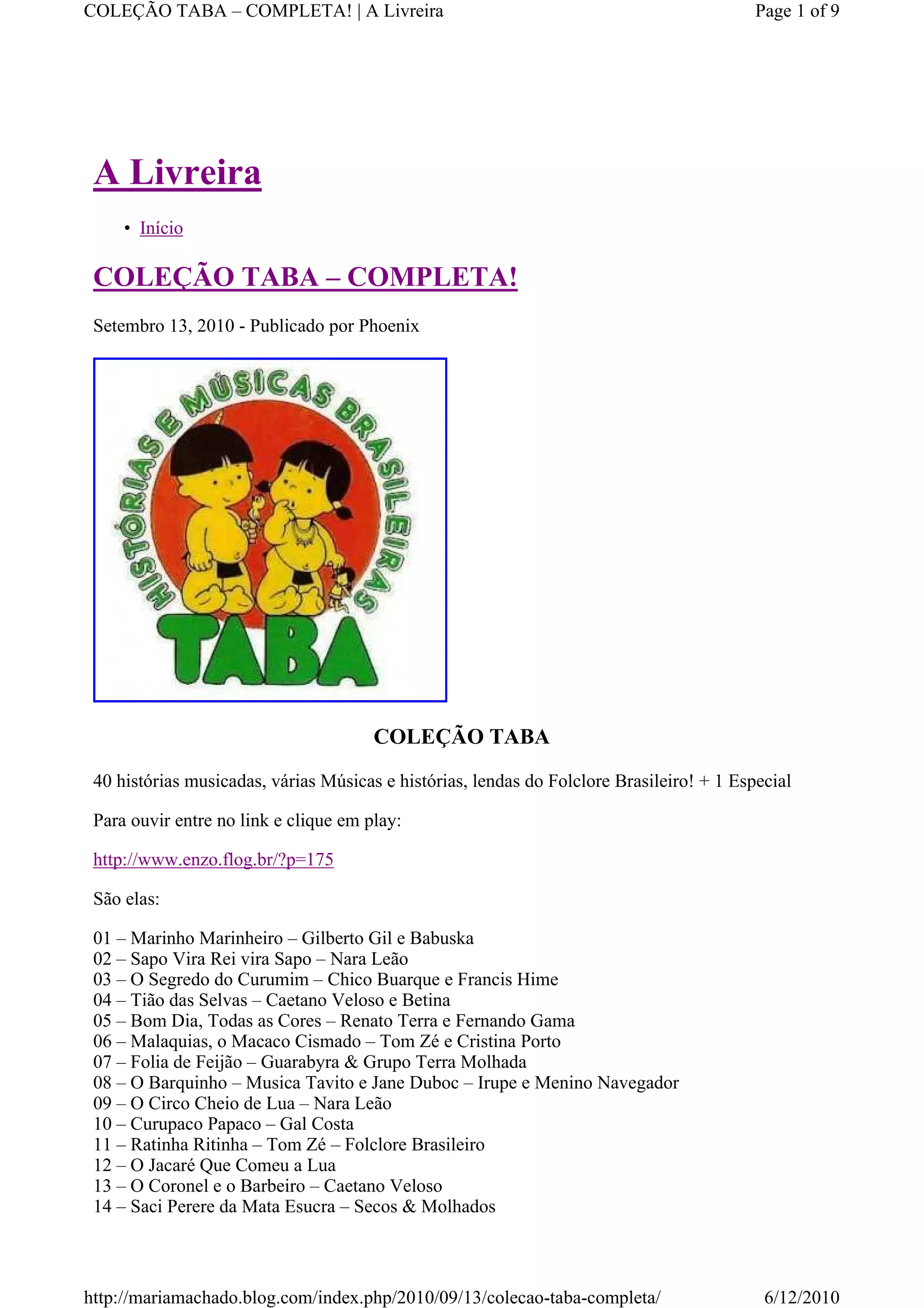 Este documento descreve a Coleção Taba, que contém 40 histórias musicadas do folclore brasileiro, além de músicas e lendas. A coleção inclui áudios e livros de cada história, disponíveis em links para download. Um encarte especial da coleção inclui músicas folclóricas gravadas em 1982.