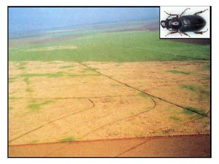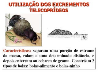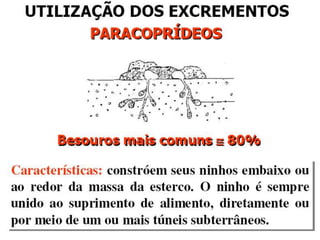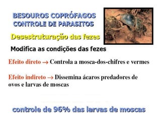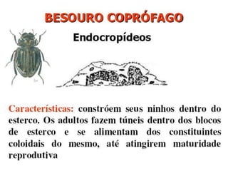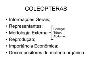 O documento resume as principais características dos besouros, incluindo sua morfologia externa, reprodução, importância econômica como decompositores de matéria orgânica.