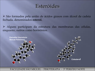 Os esteróides são formados pela união de ácidos graxos com álcool de cadeia fechada e são responsáveis pela harmonia das funções vitais do organismo. Alguns esteróides como o colesterol são essenciais para a estrutura celular, produção de hormônios e vitamina D, porém em excesso podem ser prejudiciais à saúde. O colesterol é transportado nas células por lipoproteínas LDL e HDL e níveis elevados a longo prazo podem causar aterosclerose, levando
