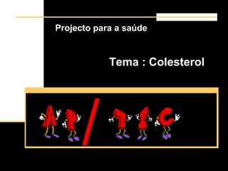 O documento discute o colesterol, definindo-o como uma gordura encontrada em animais que é importante para a estrutura do corpo, mas em excesso pode ser prejudicial. Ele lista causas como carnes gordas e alimentos com ovos, explica os tipos de colesterol, sintomas como dor no peito, e formas de prevenção e tratamento como dieta equilibrada e exercícios.