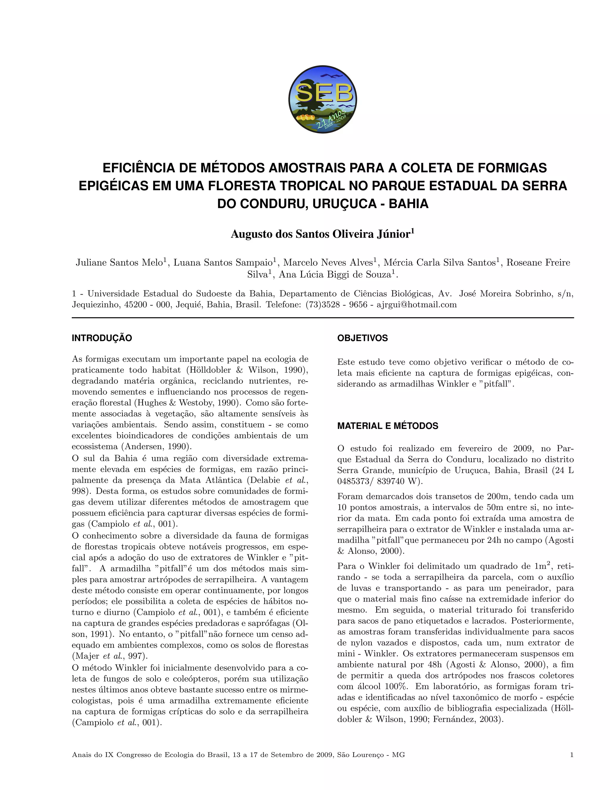 1) O estudo comparou a eficiência de dois métodos de amostragem, armadilhas Winkler e "pitfall", para coletar formigas epigéicas em uma floresta tropical no Parque Estadual da Serra do Conduru, Bahia.